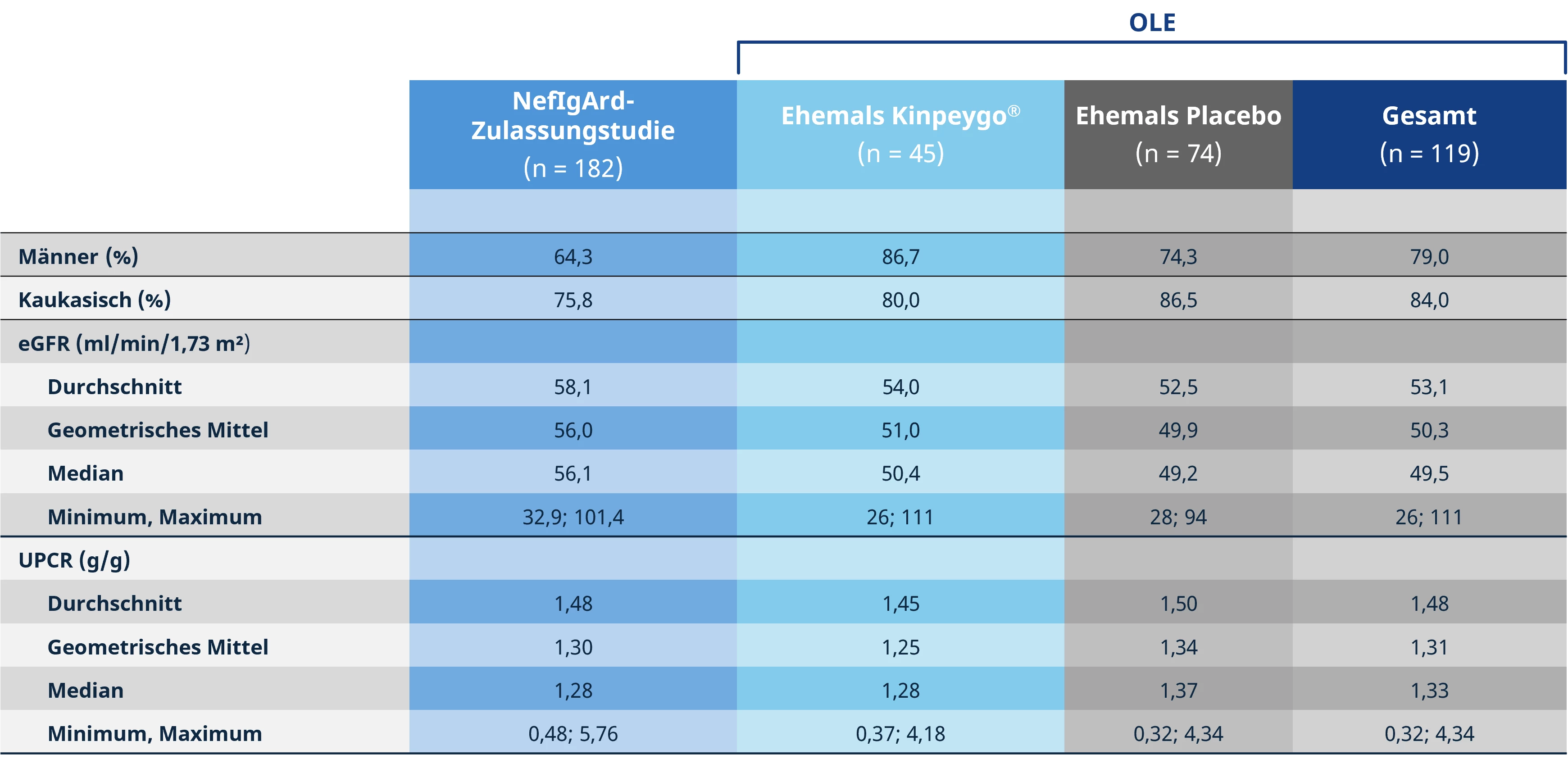 Eingeschlossen wurde sowohl die ehemalige Kinpeygo-Gruppe als auch die ehemalige Placebo-Gruppe die zu Beginn der OLE-Studie eine UPCR von ≥ 0,8 g/g oder eine Proteinausscheidung von ≥ 1,0 g/Tag hatten.